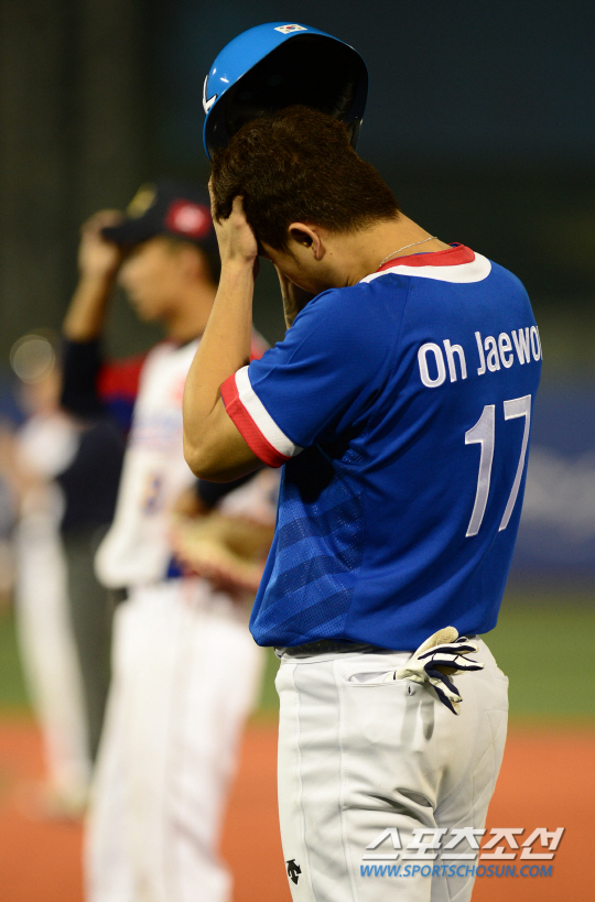 인천 아시안게임 야구대표팀이 25일 목동구장에서 홍콩과 조별리그 3차전 경기를 펼쳤다. 6회초 2사 1루 민병헌 타석 때 1루주자 오재원이 투수 교체 때 헬멧을 고쳐쓰고 있다.