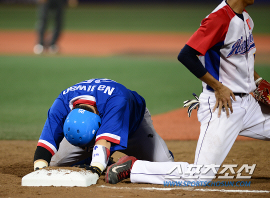 인천 아시안게임 야구대표팀이 25일 목동구장에서 홍콩과 조별리그 3차전 경기를 펼쳤다. 7회초 무사 1루 김현수의 2루수 직선타 때 1루주자 나지완이 급히 귀루해 세이프되고 있다.