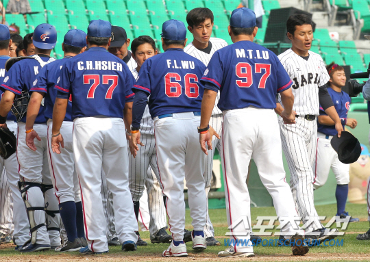 대만 야구대표팀이 27일 인천 문학야구장에서 열린 2014 인천 아시안게임 야구 준결승전 일본과의 경기에서 10대4로 완승을 거두며 결승전에 진출했다. 대만은 한국-중국 전의 승자와 28일 같은 장소에서 금메달을 놓고 맞붙는다. 경기 종료 후 대만 선수들과 일본 선수들이 인사를 나누고 있다.