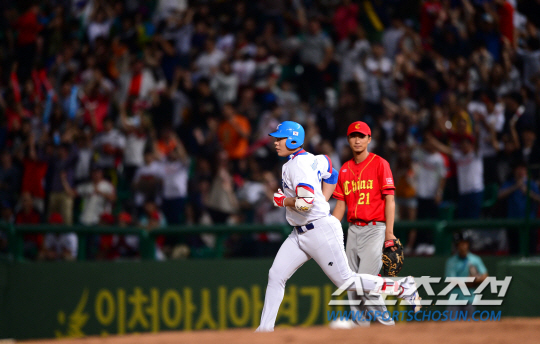 27일 인천 문학야구장에서 2014 인천아시아경기대회 야구 준결승전 대한민국과 중국의 경기가 열렸다. 대만은 일본과의 준결승 경기에서 10대4로 승리하며 결승전에 진출했다. 강정호가 3회 1사에서 중국 치찌핑을 상대로 솔로 홈런을 날렸다. 그라운드를 돌고 있는 강정호.