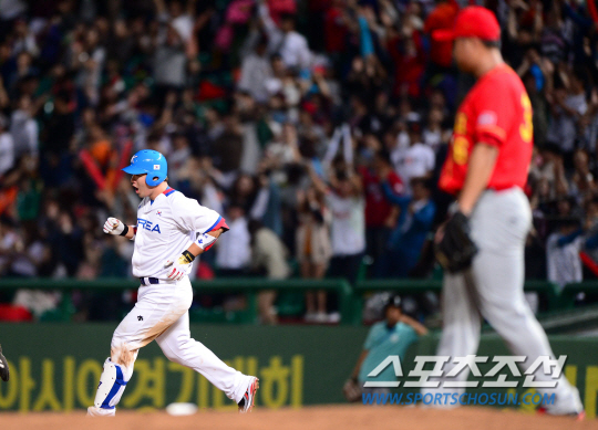 27일 인천 문학야구장에서 2014 인천아시아경기대회 야구 준결승전 대한민국과 중국의 경기가 열렸다. 박병호가 6회 무사 1,2루에서 좌월 3점 홈런을 날렸다. 그라운드를 돌고 있는 박병호.