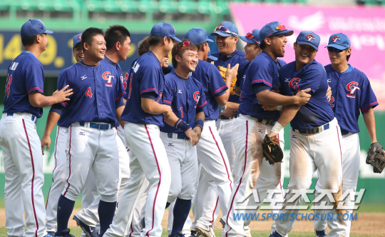 대만 야구대표팀이 27일 인천 문학야구장에서 열린 2014 인천 아시안게임 야구 준결승전 일본과의 경기에서 10대4로 완승을 거두며 결승전에 진출했다. 대만은 한국-중국 전의 승자와 28일 같은 장소에서 금메달을 놓고 맞붙는다. 승리가 확정된 경기 종료 후 대만 선수들이 그라운드에 나와 환호하고 있다. 인천=송정헌 기자 songs@sportschosun.com/2014.09.27