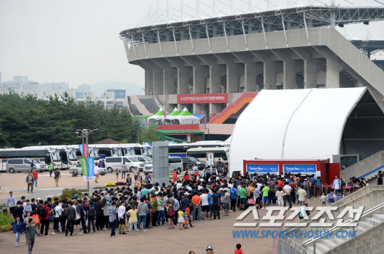 28일 인천 문학구장에서 예정된 2014 인천 아시안게임 야구 결승전 한국과 대만의 경기를 보기 위해 현장 매표소를 찾은 야구팬들이 줄을 선 채 티켓오픈을 기다리고 있다.