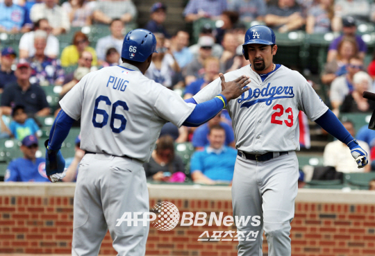 | LA 다저스가 28일(이하 한국시각) 콜로라도 로키스를 연장 끝에 물리쳤다. 사진은 지난 21일 시카고 컵스전에서 홈런을 친 애드리언 곤잘레스. ⓒAFPBBNews = News1 |