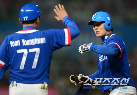 인천아시안게임 야구 한국과 대만의 결승전 경기가 28일 인천구장에서 열렸다. 1회초 선두타자 민병헌이 우전 안타를 치고 1루에 나가 윤영환코치의 축하를 받고 있다.
