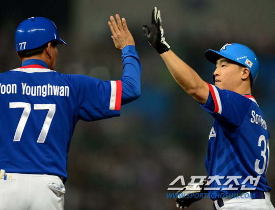 인천아시안게임 야구 한국과 대만의 결승전 경기가 28일 인천구장에서 열렸다. 1회초 무사 2루 손아섭이 1루수앞 내야안타를 친 후 윤영환 코치의 축하를 받고 있다.