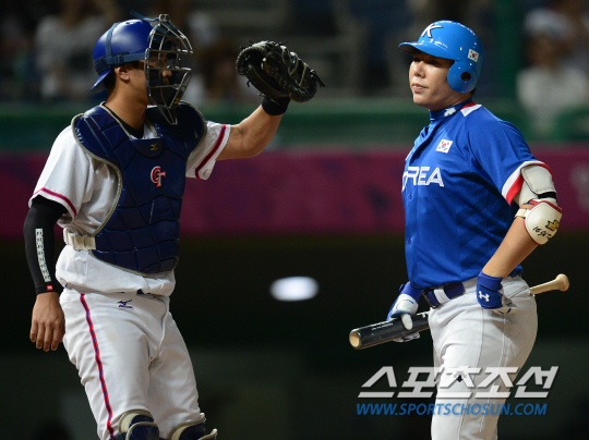 인천아시안게임 야구 한국과 대만의 결승전 경기가 28일 인천구장에서 열렸다. 1회초 1사 만루 한국 강정호가 헛스윙 삼진을 당한 후 아쉬워하고 있다.