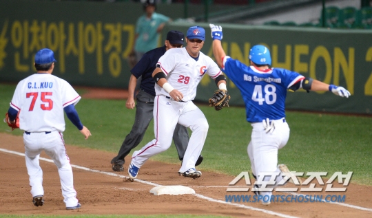 한국야구대표팀과 대만야구대표팀의 2014인천아시안게임 야구결승전이 28일 인천문학야구장에서 열렸다. 한국 1회초 무사 만루에서 나성범이 내야땅볼을 치고 1루에서 아웃되고 있다.
