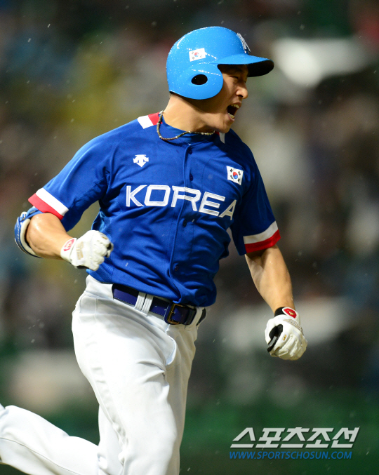 인천아시안게임 야구 한국과 대만의 결승전 경기가 28일 인천구장에서 열렸다. 5회초 2사 1,3루 한국 손아섭이 1타점 우전안타를 치고 달려나가며 환호하고 있다.