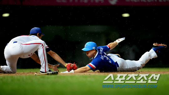 3루주자 민병헌은 가볍게 홈을 밟았다. 하지만 1루주자 손아섭이 3루를 돈 뒤, 유지현 코치를 보며 한 번 멈칫 했다. 뒤늦게 홈으로 쇄도했지만, 포수 린쿤셩의 정확한 홈 송구로 천관위에게 태그아웃되고 말았다.