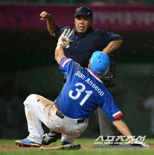 인천아시안게임 야구 한국과 대만의 결승전 경기가 28일 인천구장에서 열렸다. 5회초 2사 1,3루 한국 김현수의 유격수 땅볼 때 유격수의 실책을 틈타 1루주자 손아섭이 홈까지 쇄도했지만 태그아웃되고 있다.