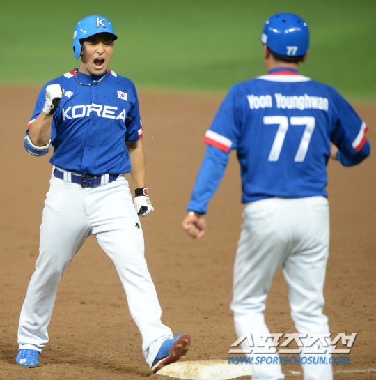 2014 인천 아시안게임 야구 결승전 한국과 대만의 경기가 28일 인천 문학구장에서 열렸다. 5회초 2사 1,3루 손아섭이 1타점 동점타를 치고 환호하고 있다.