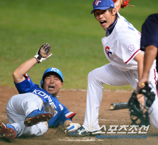 한국야구대표팀과 대만야구대표팀의 2014인천아시안게임 야구결승전이 28일 인천문학야구장에서 열렸다. 한국 5회초 2사 1,3루에서 김현수가 내야땅볼을 치고 1루에 진루한 사이 1루주자 손아섭이 홈으로 쇄도했으나 아웃되고 있다.