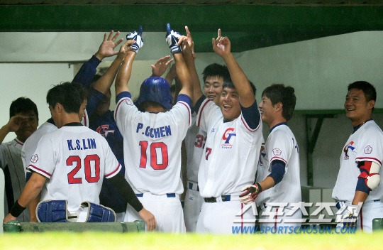 인천아시안게임 야구 한국과 대만의 결승전 경기가 28일 인천구장에서 열렸다. 6회말 1사 1,3루 대만 궈예원의 우익수 희생플라이 때 3루주자 첸핀시에가 3-2로 역전 득점을 한 후 동료들의 축하를 받고 있다.