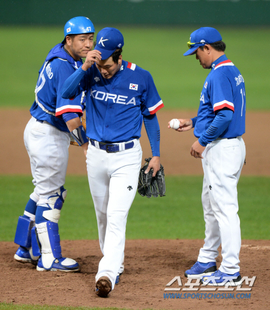 2014 인천 아시안게임 야구 결승전 한국과 대만의 경기가 28일 인천 문학구장에서 열렸다. 6회말 1사 1,3루 희생플라이로 역전을 허용한 김광현이 마운드를 내려가며 아쉬워하고 있다.
