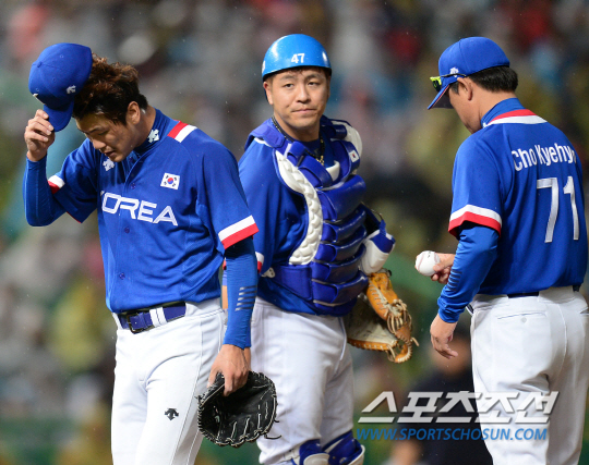 인천아시안게임 야구 한국과 대만의 결승전 경기가 28일 인천구장에서 열렸다. 6회말 1사 1,3루 대만 궈예원에게 역전 희생플라이를 허용한 김광현이 강판되고 있다.