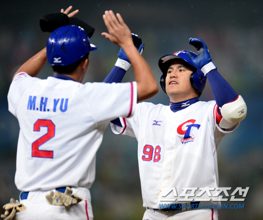 인천아시안게임 야구 한국과 대만의 결승전 경기가 28일 인천구장에서 열렸다. 6회말 1사 1,2루 대만 린한이 1타점 동점타를 친 후 기뻐하고 있다.