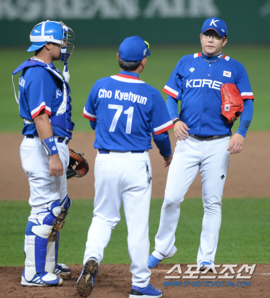 2014 인천 아시안게임 야구 결승전 한국과 대만의 경기가 28일 인천 문학구장에서 열렸다. 7회말 무사 1루, 적시타를 허용하며 1,3루의 위기를 맞은 양현종이 마운드를 내려가고 있다.