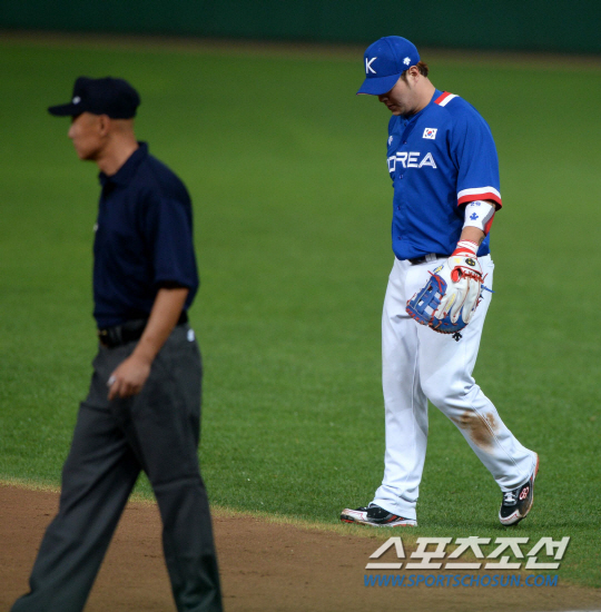 2014 인천 아시안게임 야구 결승전 한국과 대만의 경기가 28일 인천 문학구장에서 열렸다. 7회말 무사 1루수 박병호가 타구를 처리하지 못하며 진루를 허용한 후 아쉬워하고 있다.