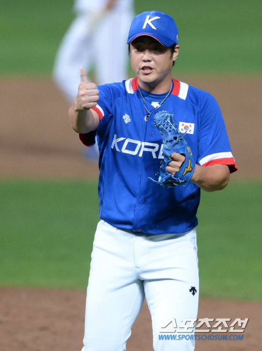 2014 인천 아시안게임 야구 결승전 한국과 대만의 경기가 28일 인천 문학구장에서 열렸다. 7회말 무사 1,3루의 위기를 무실점으로 막아낸 안지만이 포수 이재원을 향해 엄지손가락을 올리고 있다.