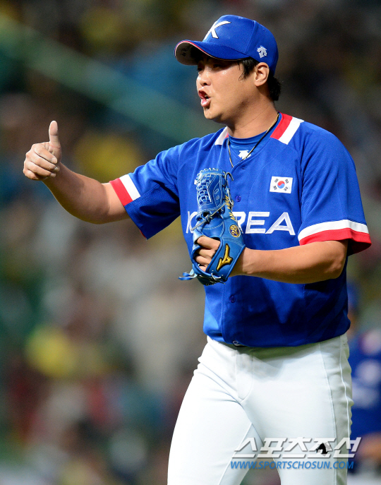 인천아시안게임 야구 한국과 대만의 결승전 경기가 28일 인천구장에서 열렸다. 7회말 2사 1,3루 대만 판즈팡을 좌익수 플라이로 잡은 안지만이 이재원 포수를 향해 엄지를 들고 있다.