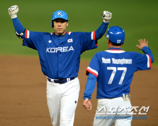 2014 인천 아시안게임 야구 결승전 한국과 대만의 경기가 28일 인천 문학구장에서 열렸다. 8회초 1사 1루, 김현수가 우익수 앞 적시타를 치고 기뻐하고 있다.