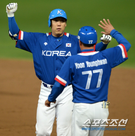 2014 인천 아시안게임 야구 결승전 한국과 대만의 경기가 28일 인천 문학구장에서 열렸다. 8회초 1사 1루, 김현수가 우익수 앞 적시타를 치고 기뻐하고 있다.