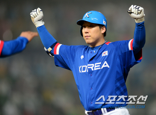 인천아시안게임 야구 한국과 대만의 결승전 경기가 28일 인천구장에서 열렸다. 8회초 1사 1루 김현수가 우전 안타를 친 후 환호하고 있다.