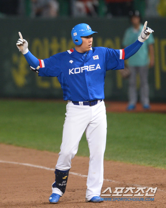 한국야구대표팀과 대만야구대표팀의 2014인천아시안게임 야구결승전이 28일 인천문학야구장에서 열렸다. 한국 8회초 1사 1루에서 김현수가 우중간을 가르는 진루타를 치고 1루에서 환호하고 있다.