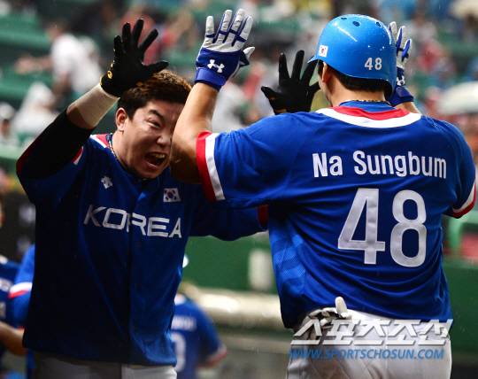 인천아시안게임 야구 한국과 대만의 결승전 경기가 28일 인천구장에서 열렸다. 8회초 1사 만루 나성범이 역전 1타점 내야땅볼을 치고 들어오자 나지완이 환호하고 있다.