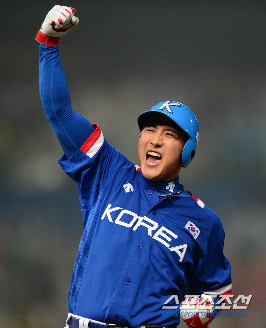 인천아시안게임 야구 한국과 대만의 결승전 경기가 28일 인천구장에서 열렸다. 8회초 2사 2,3루 황재균이 2타점 안타를 치고 환호하고 있다.