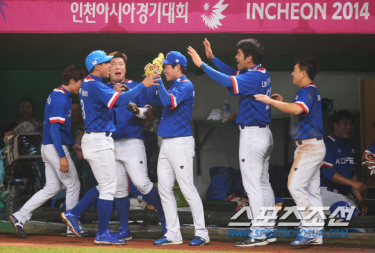 한국야구대표팀과 대만야구대표팀의 2014인천아시안게임 야구결승전이 28일 인천문학야구장에서 열렸다. 한국 8회초 2사 .2,3루에서 황재균이 2타점 적시안타를 치고 동료들의 축하를 받고 있다.