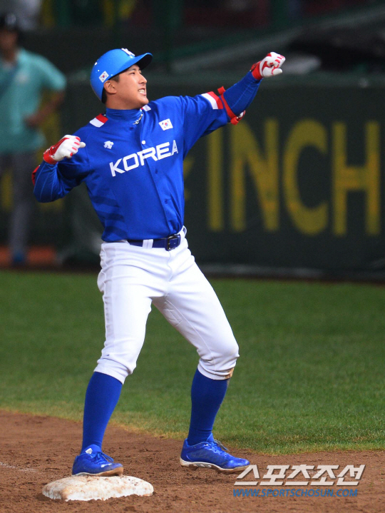 한국야구대표팀과 대만야구대표팀의 2014인천아시안게임 야구결승전이 28일 인천문학야구장에서 열렸다. 한국 8회초 2사 .2,3루에서 황재균이 2타점 적시안타를 치고 포효하고 있다.