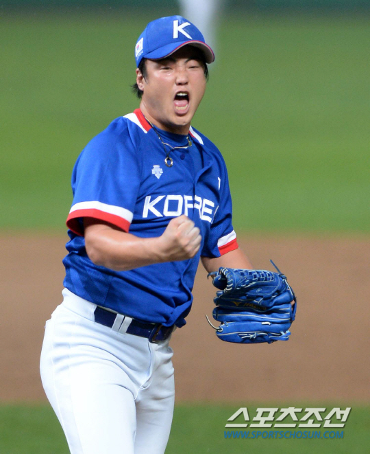 2014 인천 아시안게임 야구 결승전 한국과 대만의 경기가 28일 인천 문학구장에서 열렸다. 8회말 2사 안지만이 마지막 타자를 삼진처리하며 무실점으로 이닝을 마친 후 포효하고 있다.