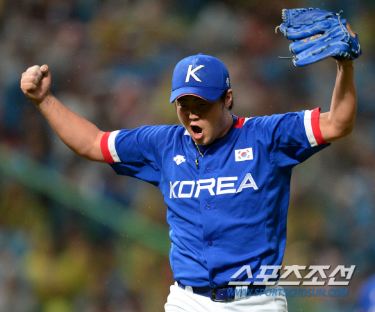 인천아시안게임 야구 한국과 대만의 결승전 경기가 28일 인천구장에서 열렸다. 8회말 대만 공격을 삼자범퇴로 막은 안지만이 환호하고 있다.