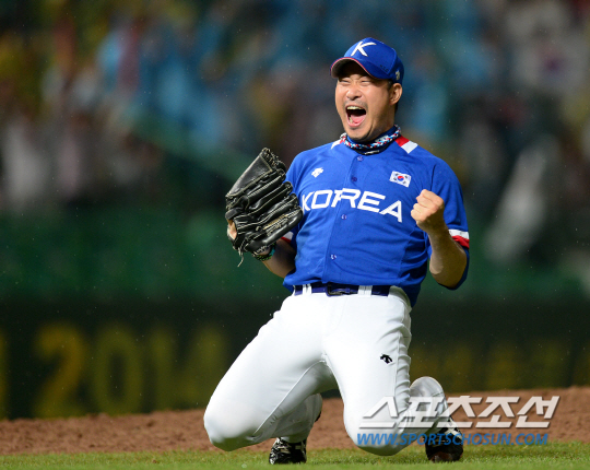 한국 야구대표팀이 대만을 꺾고 금메달을 차지했다. 인천아시안게임 야구 한국과 대만의 결승전 경기가 28일 인천구장에서 열렸다. 9회말 1사후 마운드에 오른 봉중근이 두 타자를 잡으며 우승을 확정지은 후 환호하고 있다.