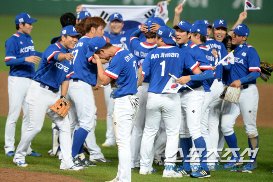 2014 인천 아시안게임 야구 결승전 한국과 대만의 경기가 28일 인천 문학구장에서 열렸다. 한국이 대만을 6-3으로 누르고 금메달을 획득했다. 경기가 종료되자 환호하는 선수들의 모습.