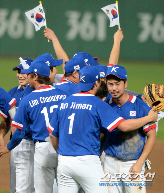 2014 인천 아시안게임 야구 결승전 한국과 대만의 경기가 28일 인천 문학구장에서 열렸다. 한국이 대만을 6-3으로 누르고 금메달을 획득했다. 경기가 종료되자 환호하는 선수들의 모습.
