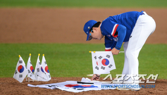 한국야구대표팀과 대만야구대표팀의 2014인천아시안게임 야구결승전이 28일 인천문학야구장에서 열렸다. 한국팀이 대만을 꺾고 금메달을 확정짓자 투수 양현종이 마운드에 태극기를 펼치고 있다.