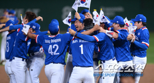 한국야구대표팀과 대만야구대표팀의 2014인천아시안게임 야구결승전이 28일 인천문학야구장에서 열렸다. 류중일호 선수들이 대만을 상대로 6대3승리를 확정짓고 마운드에 뭉쳐 환호하고 있다.