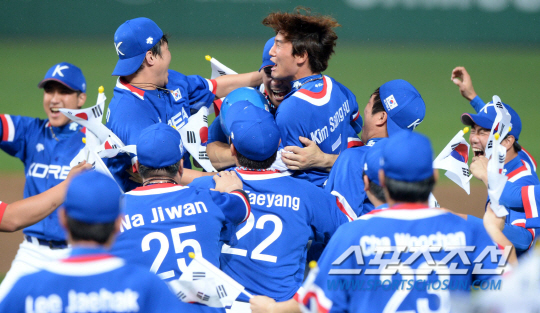2014 인천 아시안게임 야구 결승전 한국과 대만의 경기가 28일 인천 문학구장에서 열렸다. 한국이 대만을 6-3으로 누르고 금메달을 획득했다. 경기가 종료되자 환호하는 선수들의 모습.