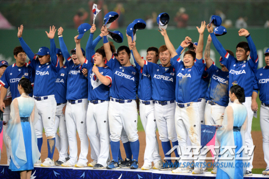 2014 인천 아시안게임 야구 결승전 한국과 대만의 경기가 28일 인천 문학구장에서 열렸다. 한국이 대만을 6-3으로 누르고 금메달을 획득했다. 이어 진행된 시상식에서 시상대에 오르며 환호하는 선수들의 모습.