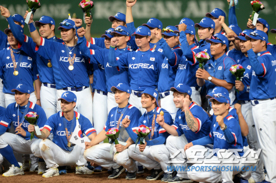 2014 인천 아시안게임 야구 결승전 한국과 대만의 경기가 28일 인천 문학구장에서 열렸다. 한국이 대만을 6-3으로 누르고 금메달을 획득했다. 이어 진행된 시상식에서 류중일 감독과 선수들이 기념촬영을 하고 있다.