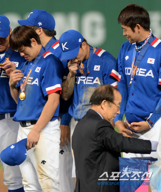 2014 인천 아시안게임 야구 결승전 한국과 대만의 경기가 28일 인천 문학구장에서 열렸다. 한국이 대만을 6-3으로 누르고 금메달을 획득했다. 이어 진행된 시상식에서 금메달을 수여받는 선수들의 모습.