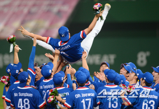 한국야구대표팀과 대만야구대표팀의 2014인천아시안게임 야구결승전이 28일 인천문학야구장에서 열렸다. 대만을 상대로 6대3 승리를 확정짓고 금메달을 목에 건 대표팀 선수들이 승리투수 안지만을 헹가래 치고 있다.