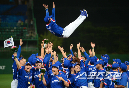 한국 야구대표팀이 대만을 꺾고 금메달을 차지했다. 인천아시안게임 야구 한국과 대만의 결승전 경기가 28일 인천구장에서 열렸다. 대만을 6-3으로 이긴 대표팀이 시상식에서 금메달을 목에 걸고 류중일 감독을 헹가래치고 있다.