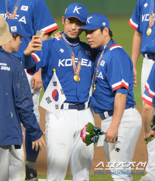 2014 인천 아시안게임 야구 결승전 한국과 대만의 경기가 28일 인천 문학구장에서 열렸다. 한국이 대만을 6-3으로 누르고 금메달을 획득했다. 이어 진행된 시상식에서 이태양과 강정호가 셀카를 찍고 있다.