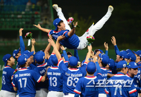 한국 야구대표팀이 대만을 꺾고 금메달을 차지했다. 인천아시안게임 야구 한국과 대만의 결승전 경기가 28일 인천구장에서 열렸다. 대만을 6-3으로 이긴 대표팀이 시상식에서 금메달을 목에 걸고 안지만을 헹가래치고 있다.