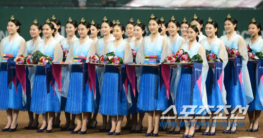 한국 야구대표팀이 대만을 꺾고 금메달을 차지했다. 인천아시안게임 야구 한국과 대만의 결승전 경기가 28일 인천구장에서 열렸다. 시상식에서 예쁜 한복을 입은 시상요원들이 금메달과 꽃다발을 들고 있다.