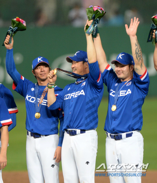 2014 인천 아시안게임 야구 결승전 한국과 대만의 경기가 28일 인천 문학구장에서 열렸다. 한국이 대만을 6-3으로 누르고 금메달을 획득했다. 이어 진행된 시상식에서 임창용-봉중근-박병호가 메달과 함께 기뻐하고 있다.